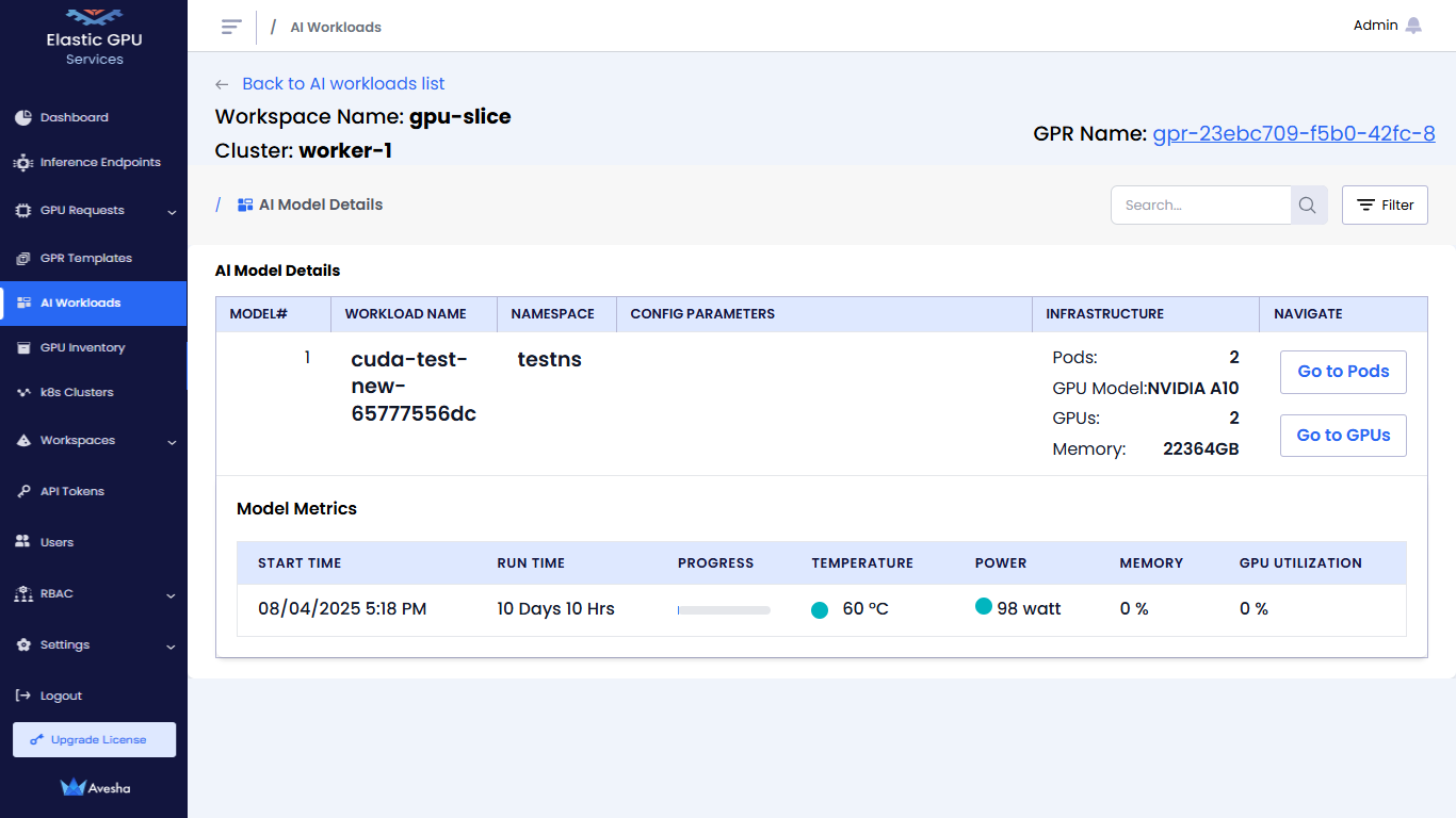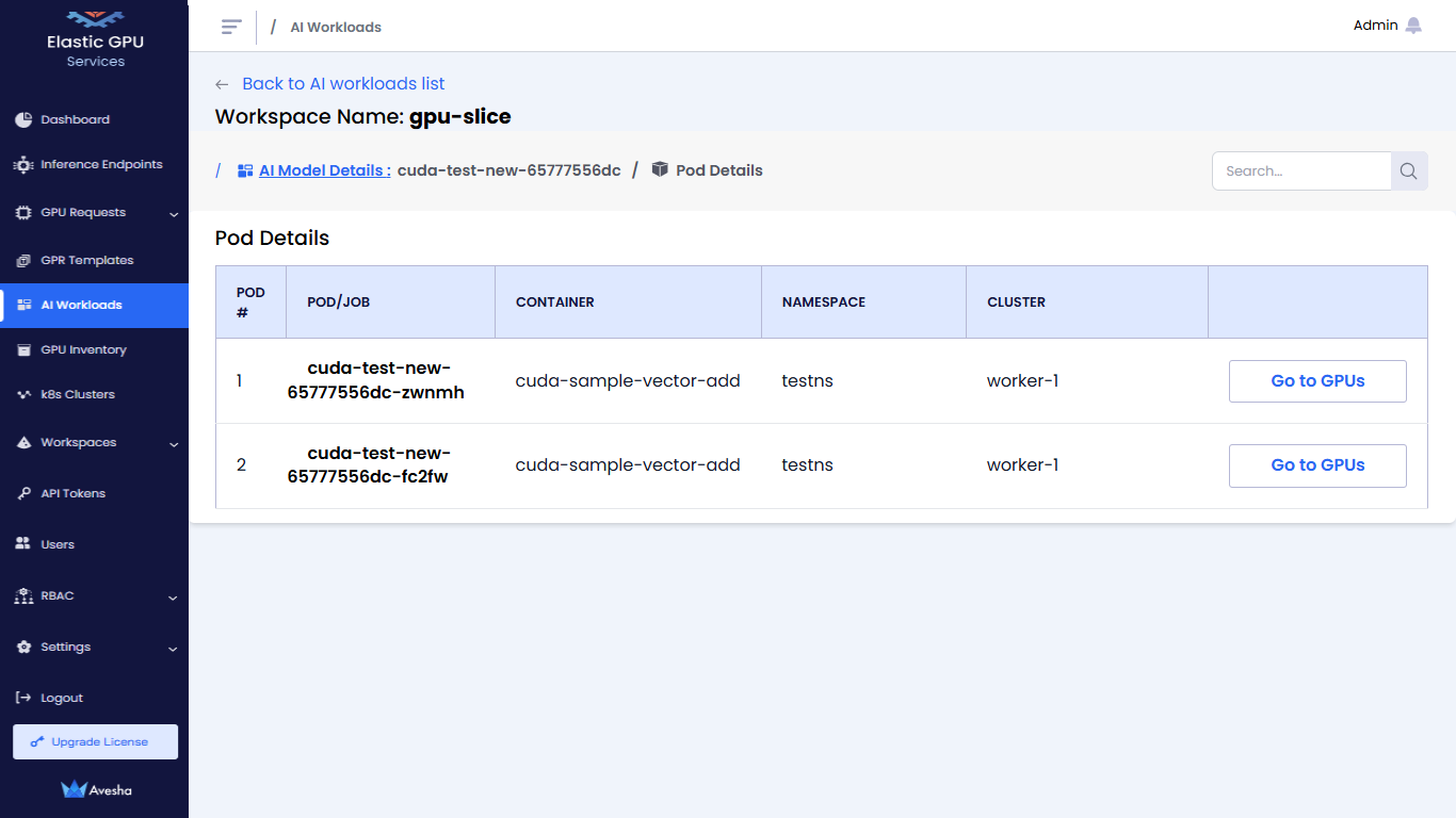 On the AI Model Details page, click Go to Pods to view the pods running with GPUs in a workspace.