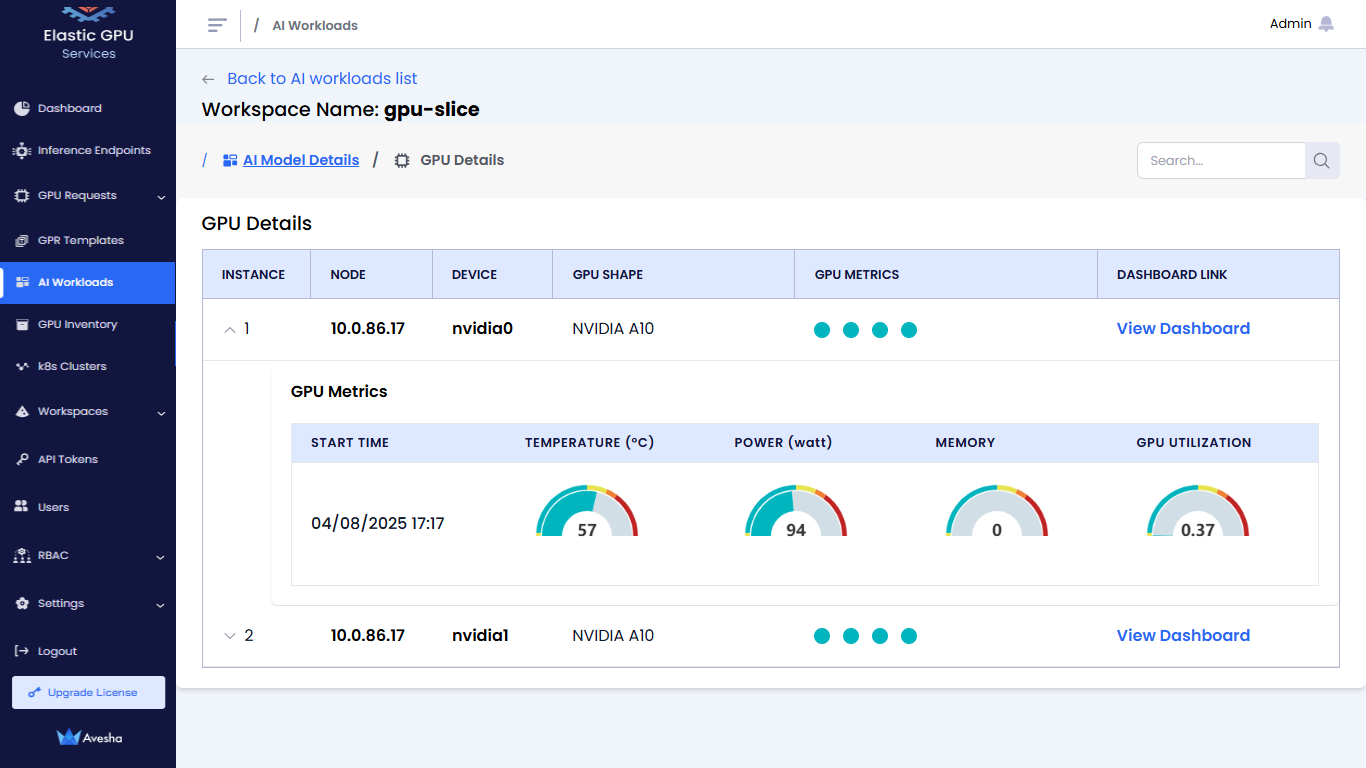 Under GPU Details, click View Dashboard in the table to view time-series data for the selected GPU device.