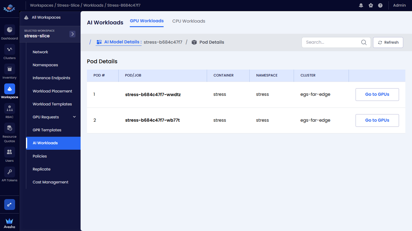 On the AI Model Details page, Under Navigate, click Go to Pods to view the pods running with GPUs in a workspace.